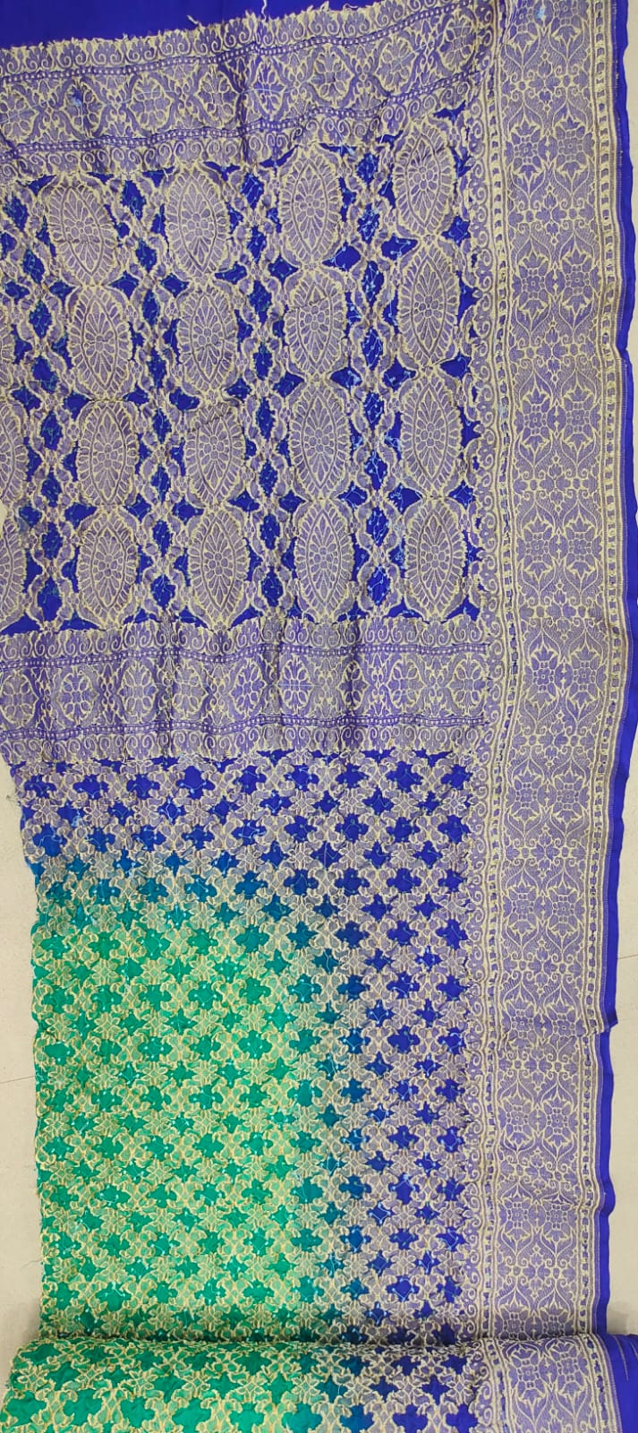 A stunning saree that fades from royal blue to teal green, featuring an elaborate gold woven brocade pattern of floral and geometric shapes with a wide, decorative border.
