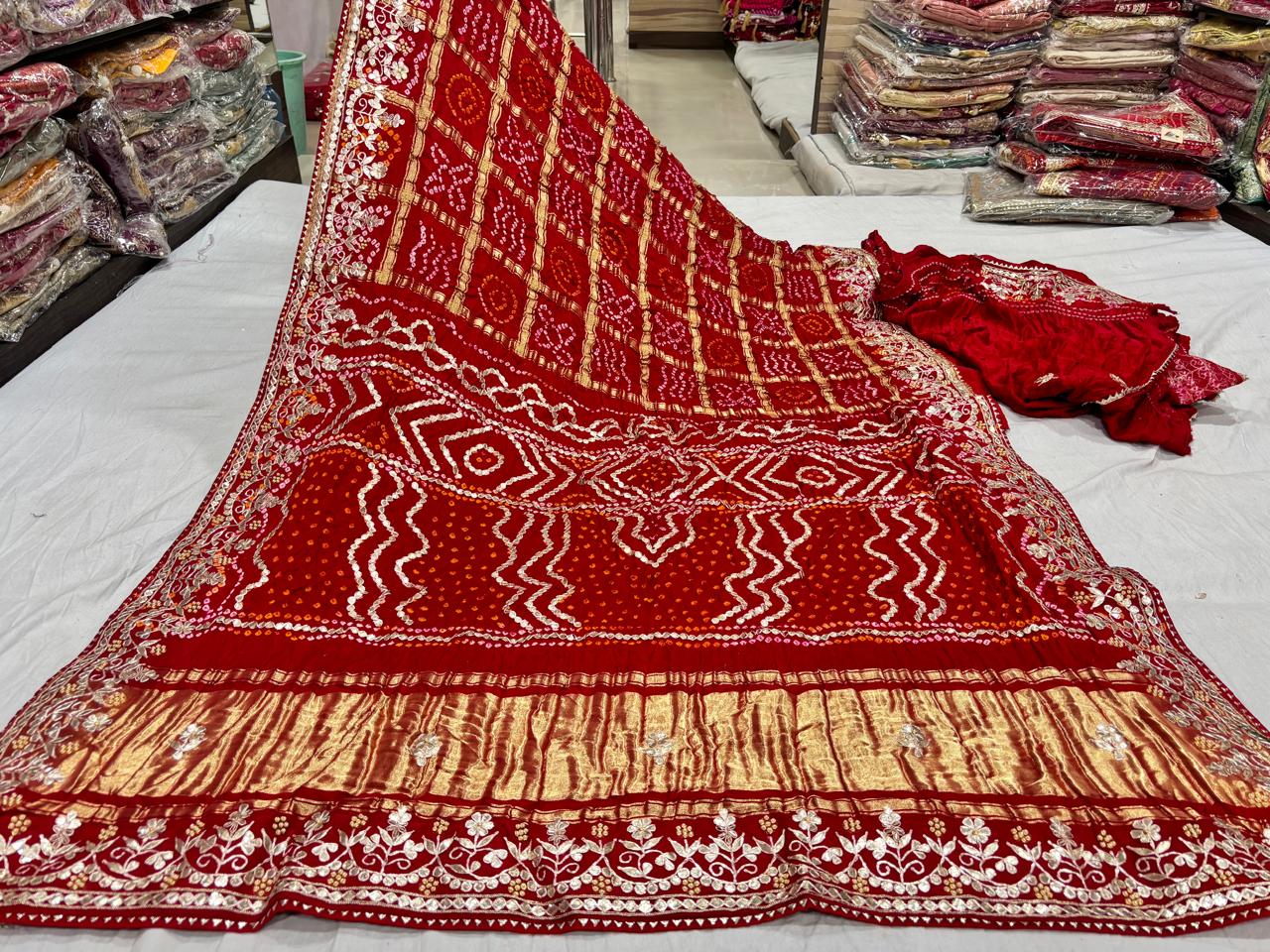 A stunning traditional Bandhej saree available in royal shades Classic Red. Adorned with intricate white tie-dye patterns, vibrant multicolor Gotta Patti motifs, and a rich golden zari border, this saree is crafted to give a grand festive and bridal look.
