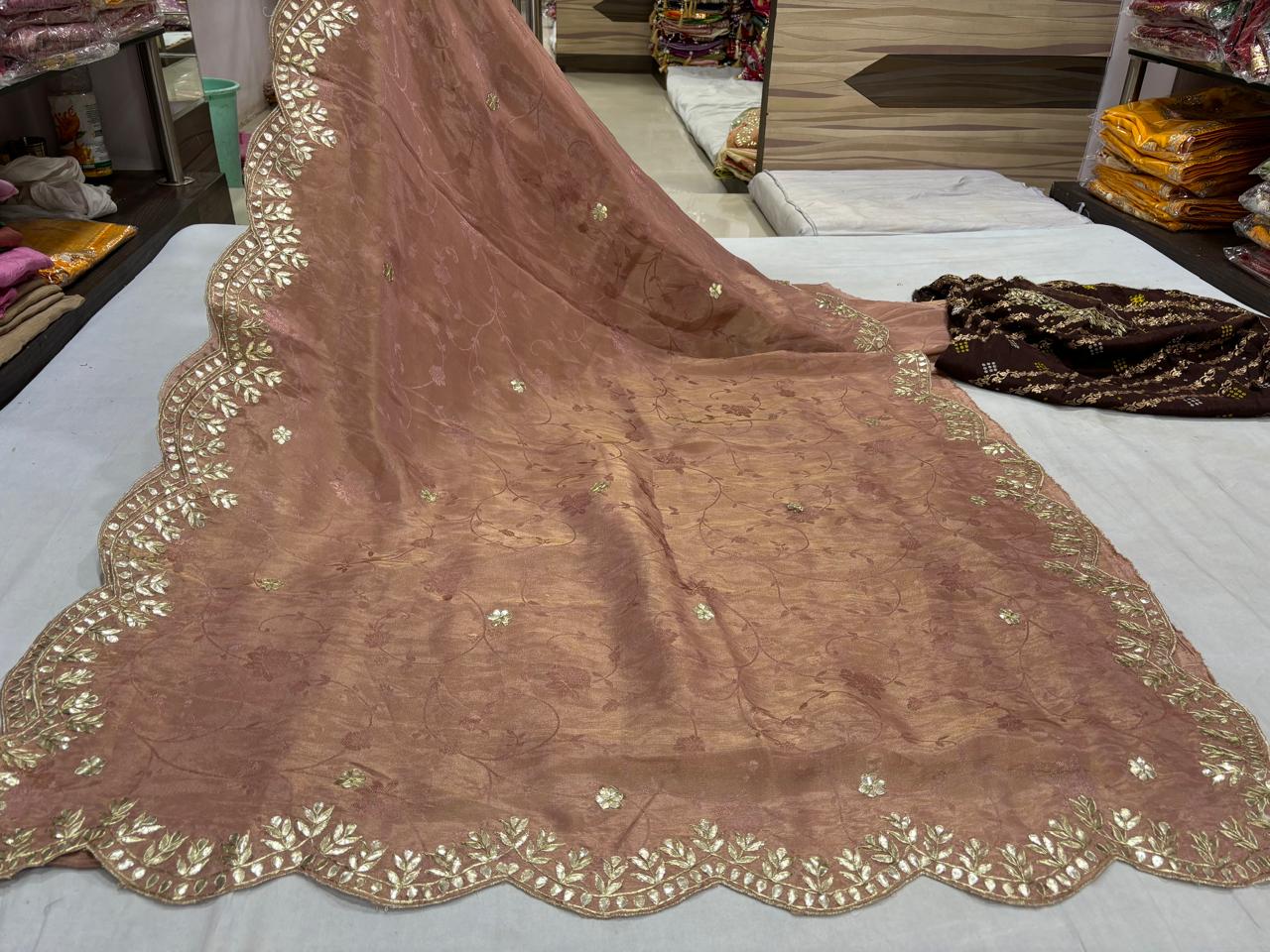 A beautiful dusty pink saree with intricate Gota Patti work. The saree has a stunning border with a combination of leaf and floral patterns, with a brocade pattern on the fabric.