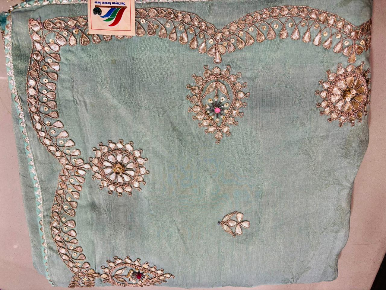 A beautiful dusty grey saree with Gota Patti and mirror work. The border features a combination of floral and mirror patterns, with large floral motifs on the body.