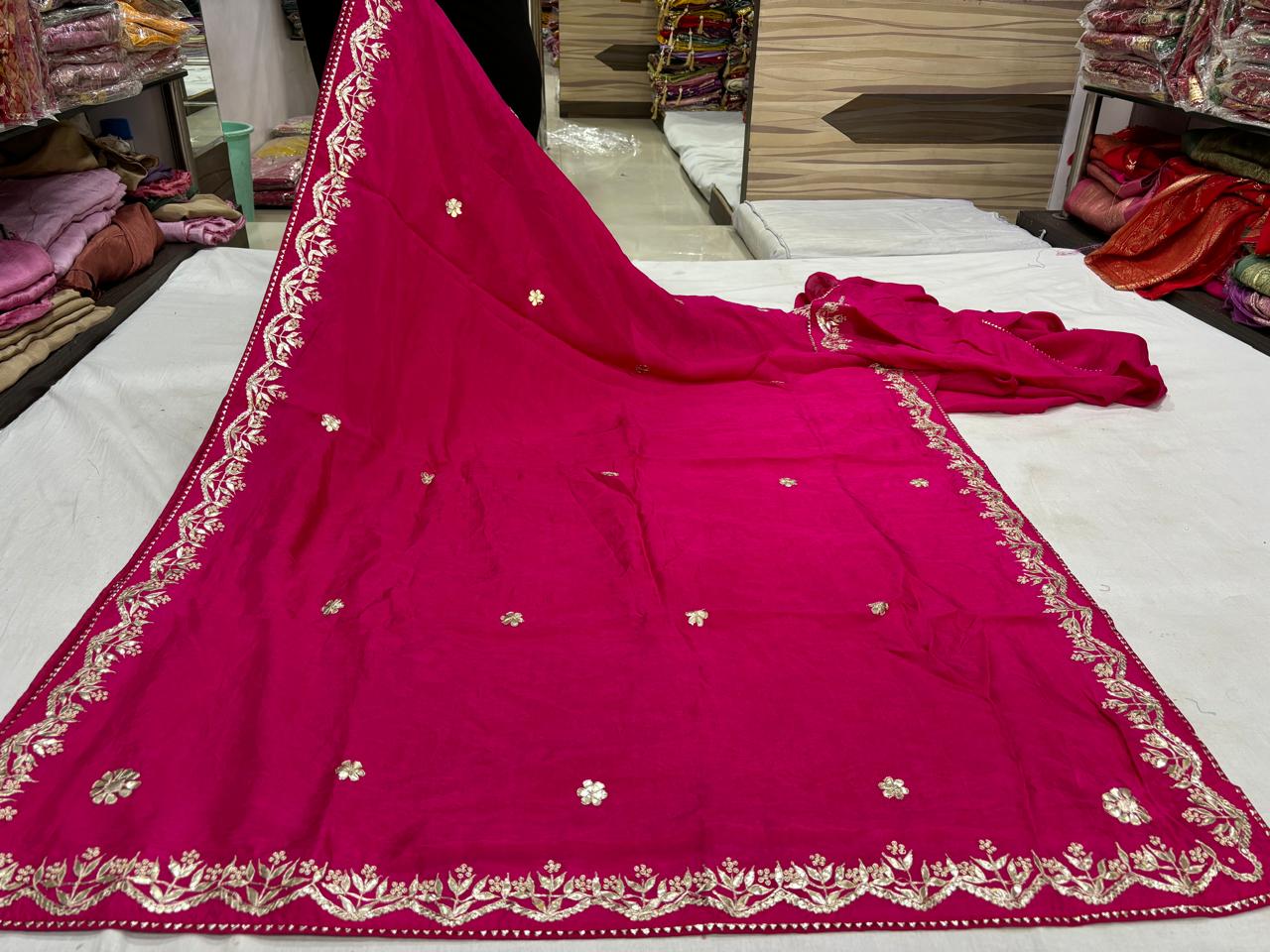 Vibrant rani pink saree featuring elegant gotta patti embroidery with floral bootis scattered across the body. The finely crafted border adds a luxurious traditional touch. A perfect choice for weddings, festive celebrations, and party wear.