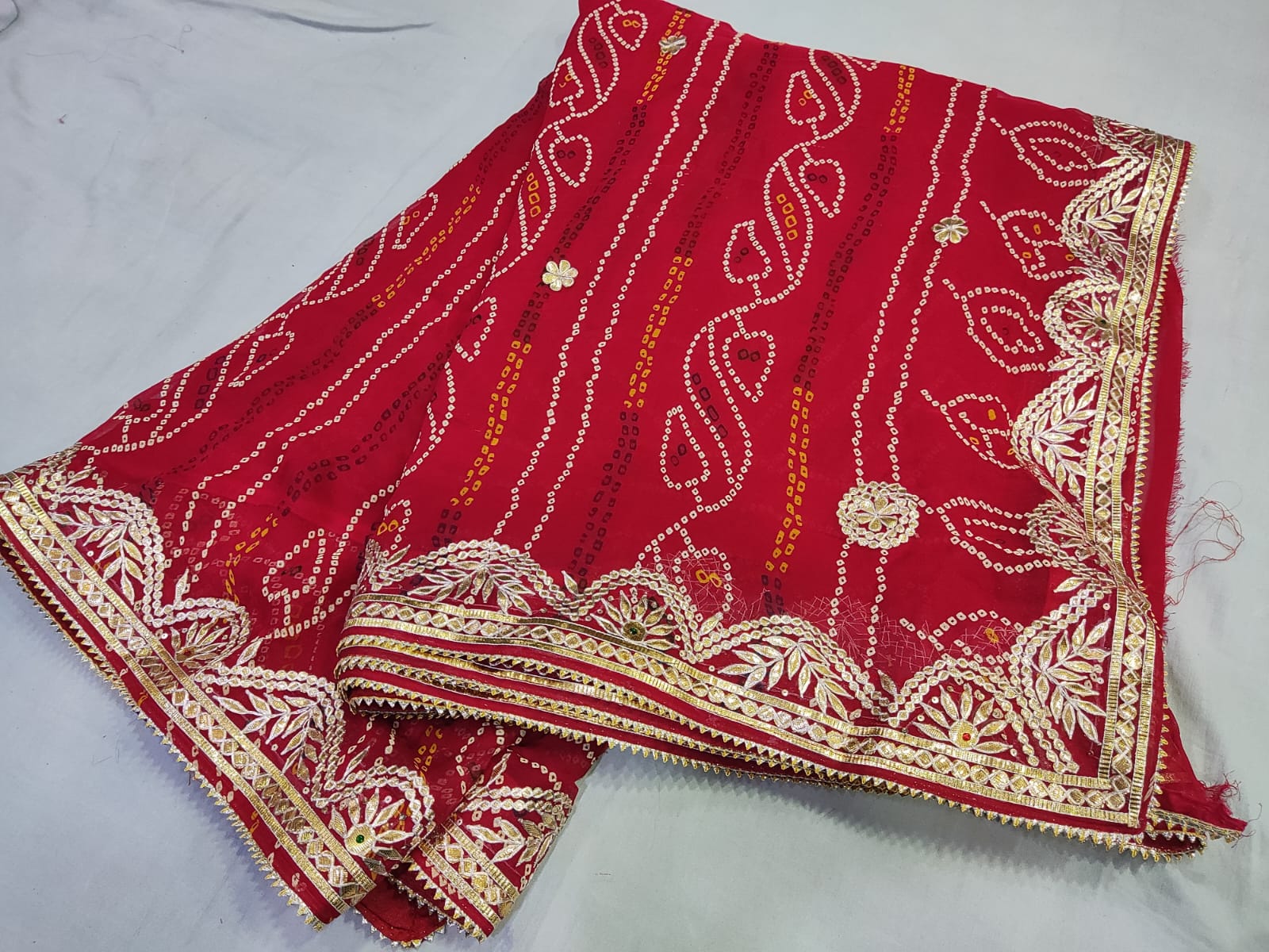Elevate your ethnic look with this exquisite Bandhani Gotta Patti Chunri Dupatta, crafted in rich shades of red and maroon. The dupatta features traditional Bandhani tie-dye motifs enhanced with intricate gold gota patti lace borders, adding a regal and festive charm. Delicate floral accents and flowing patterns make it a perfect blend of tradition and elegance.